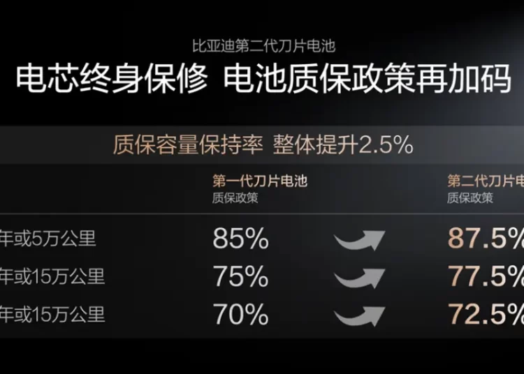 第二代刀片電池通過打造“鋰離子高速通道”和“全溫域智能熱管理系統”,實現了更低的產熱和更高效、均勻的散熱,讓閃充對電池壽命幾乎沒有影響。基於這樣的底氣,比亞迪還宣布電池質保政策再加碼!第二代刀片電池質保的“容量保持率”整體提升2.5%,電芯依舊是“終身保修”,這就是第二代刀片電池,給所有用戶的安心承諾。
